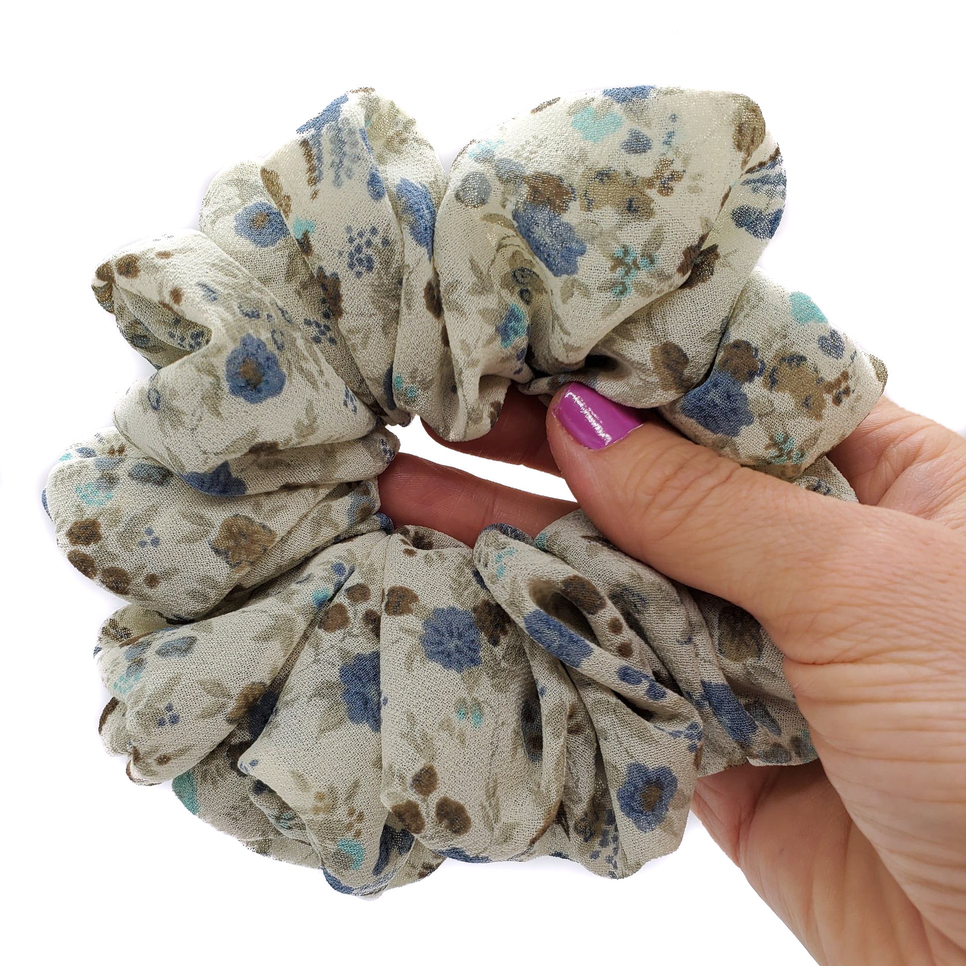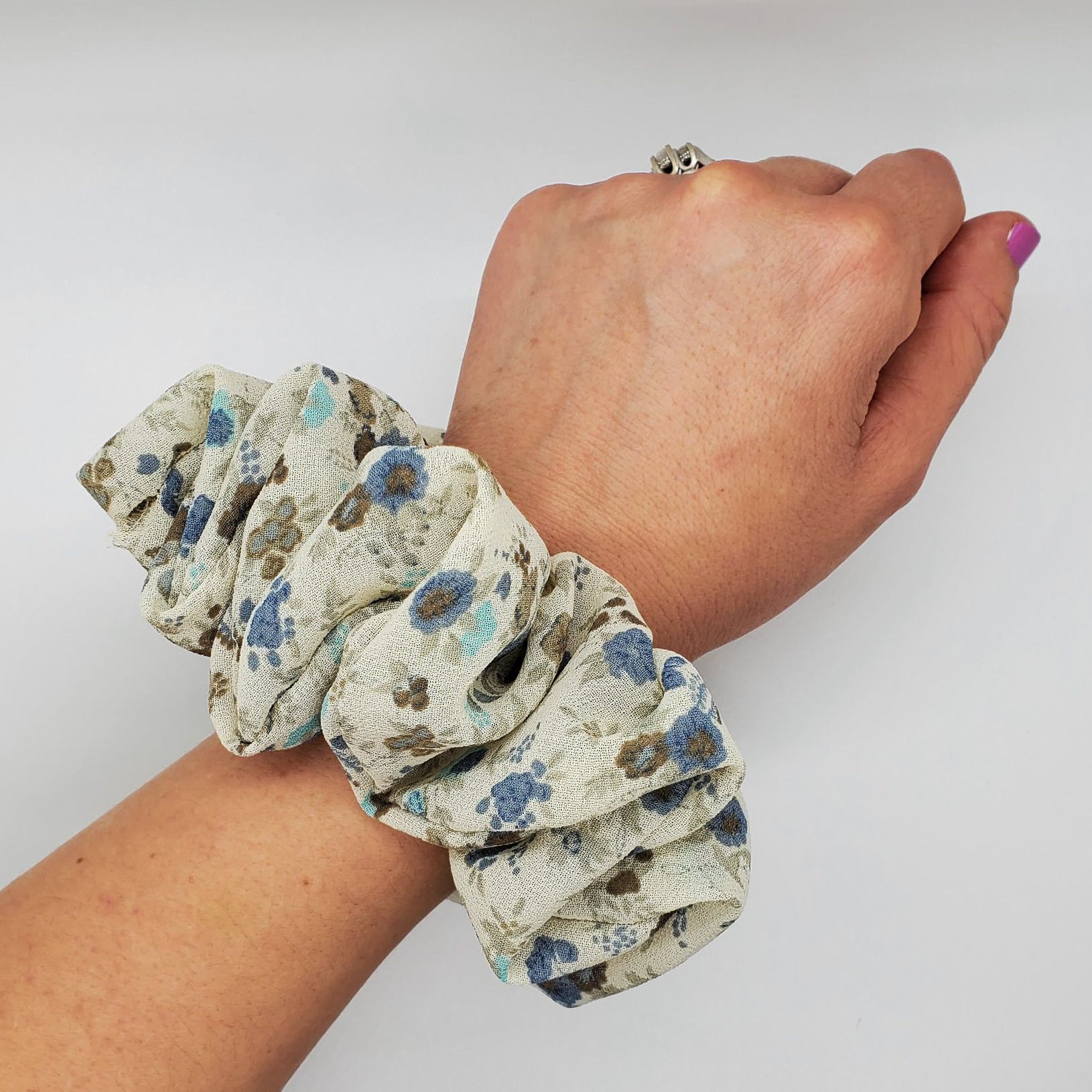 Scrunchie grande en estampado floral azul y cafe con fondo beige, super bombacha, perfecta para sostener una coleta o solo una parte de tu cabello o simplemente tenerla lista en tu mano para utilizarla a la hora que necesites.