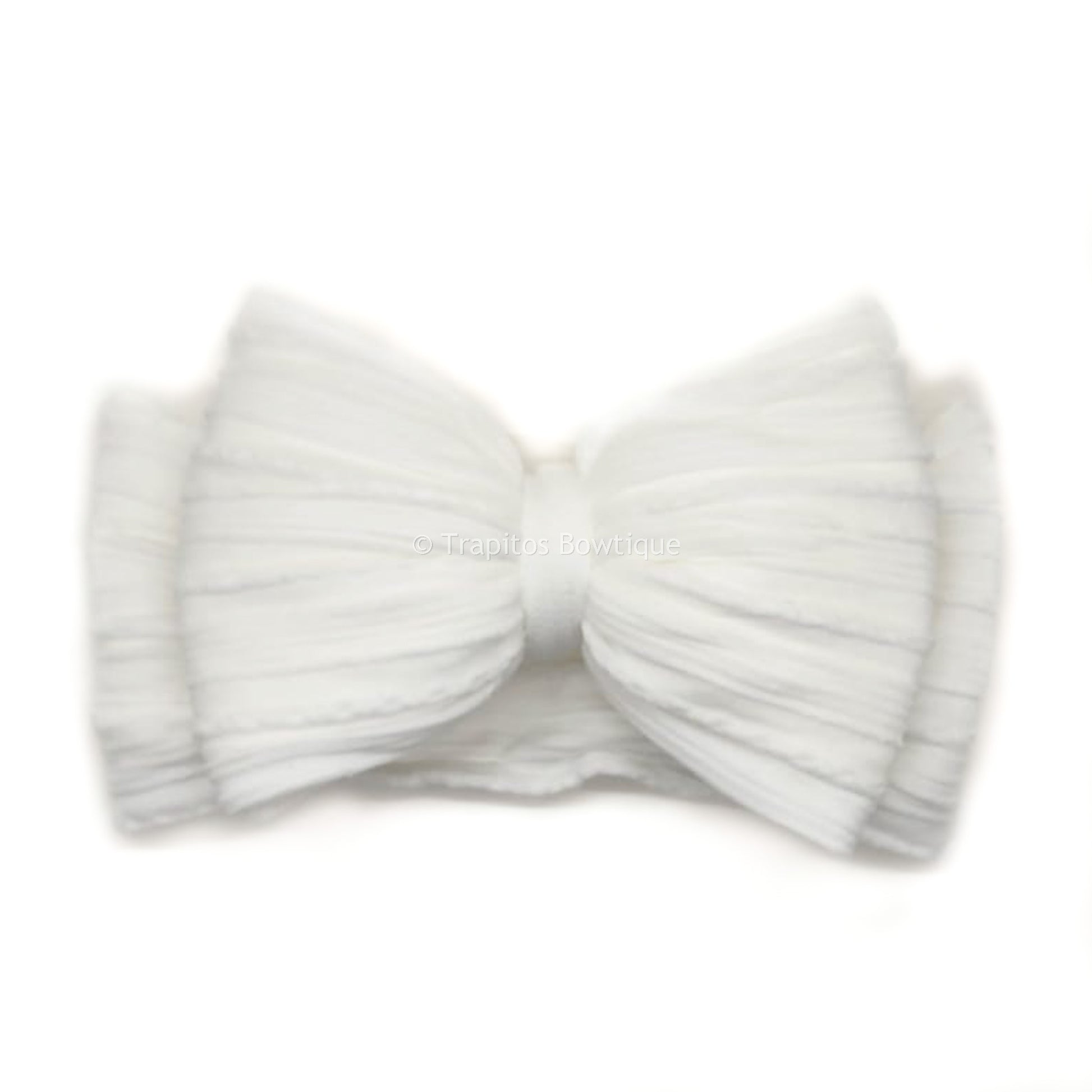 Diadema tipo turbante atado al centro para formar un moño. Elaborada con nylon y algodon elastico para mayor suavidad y confort de tu bebe.