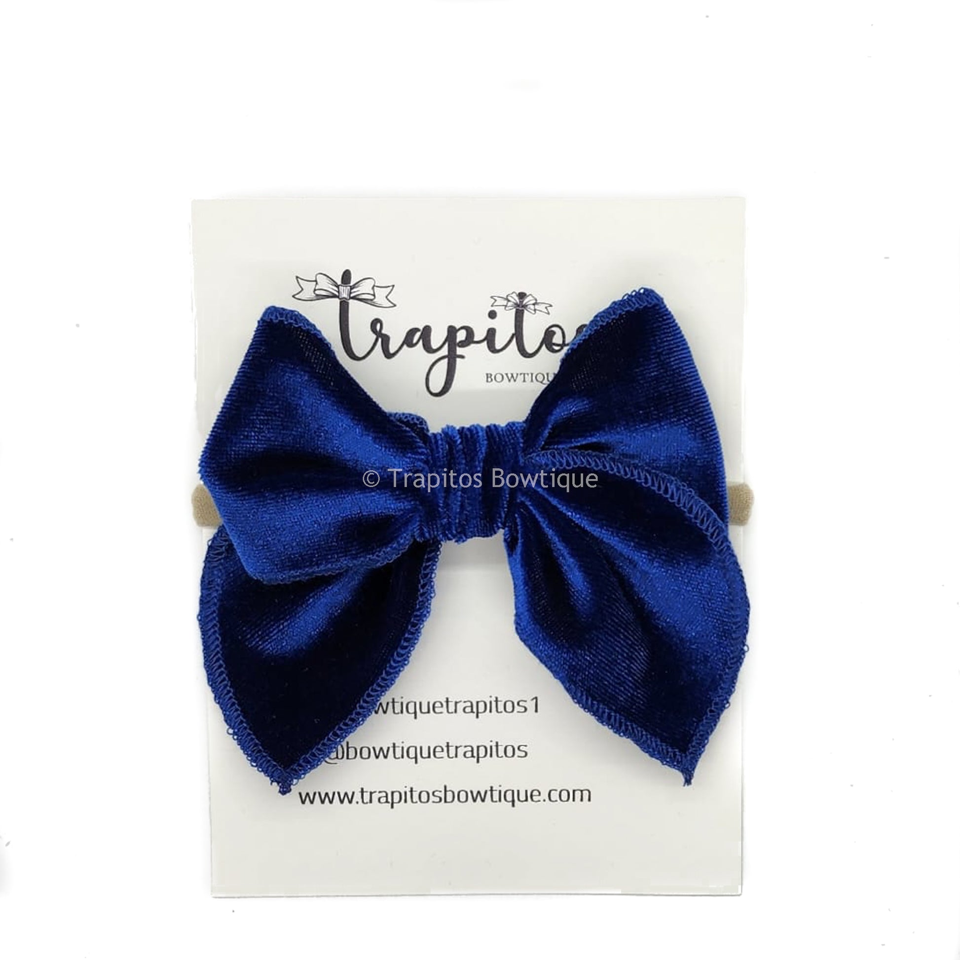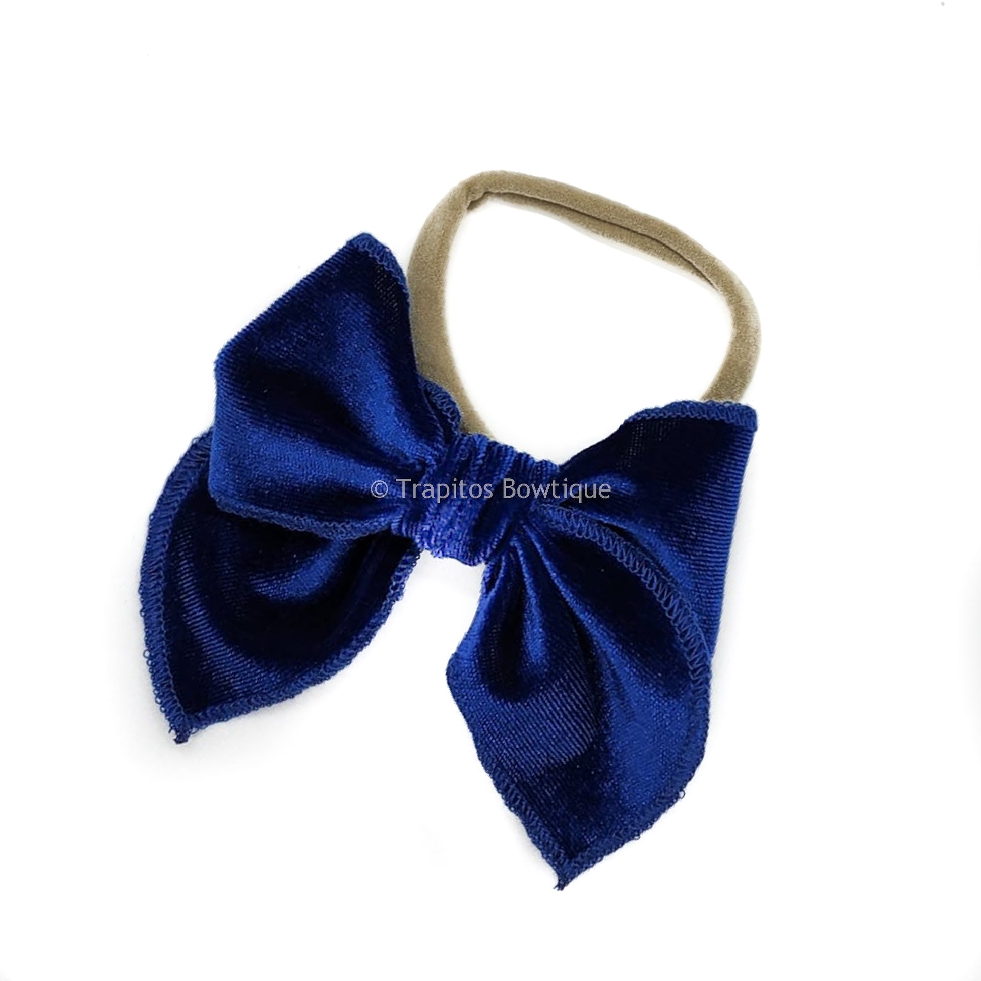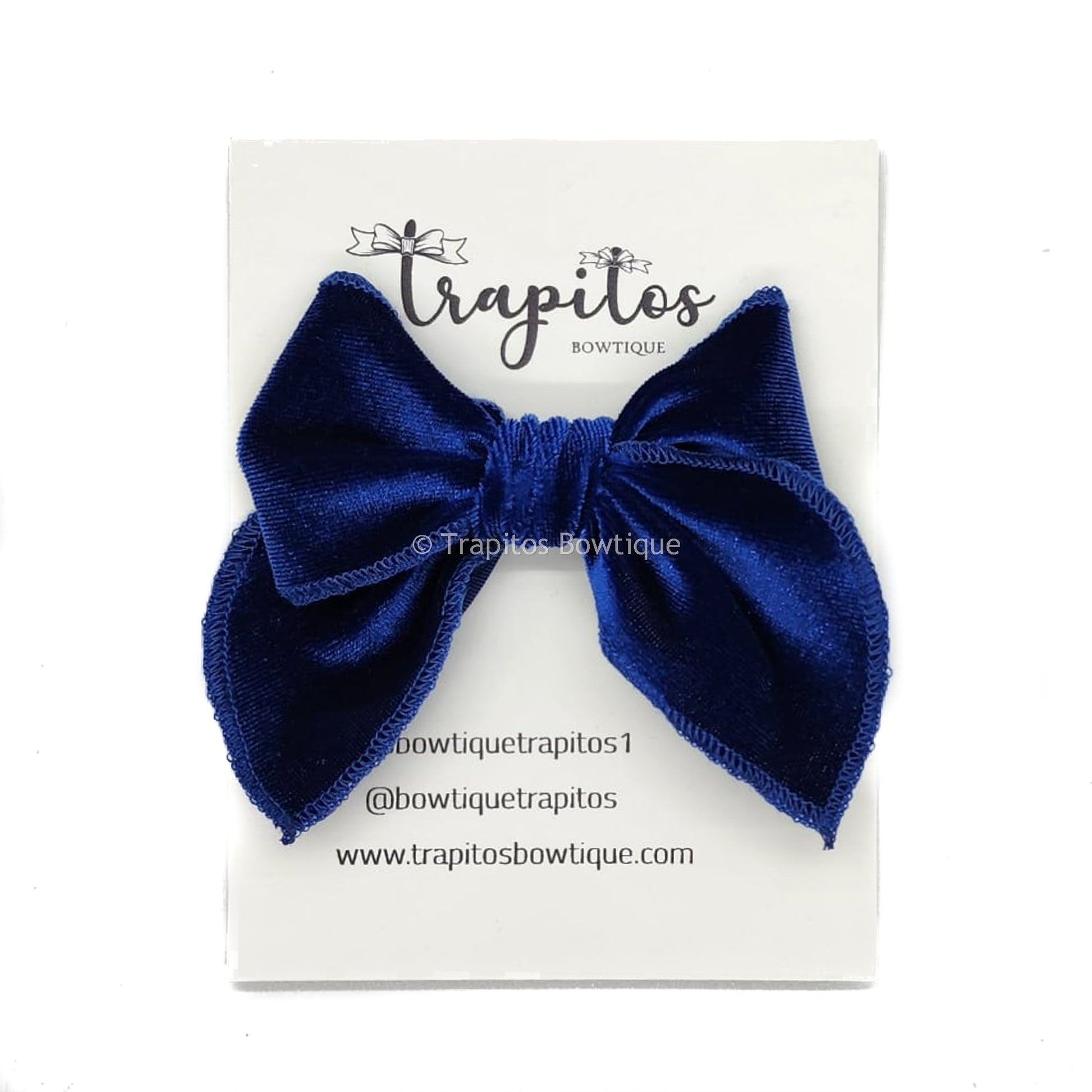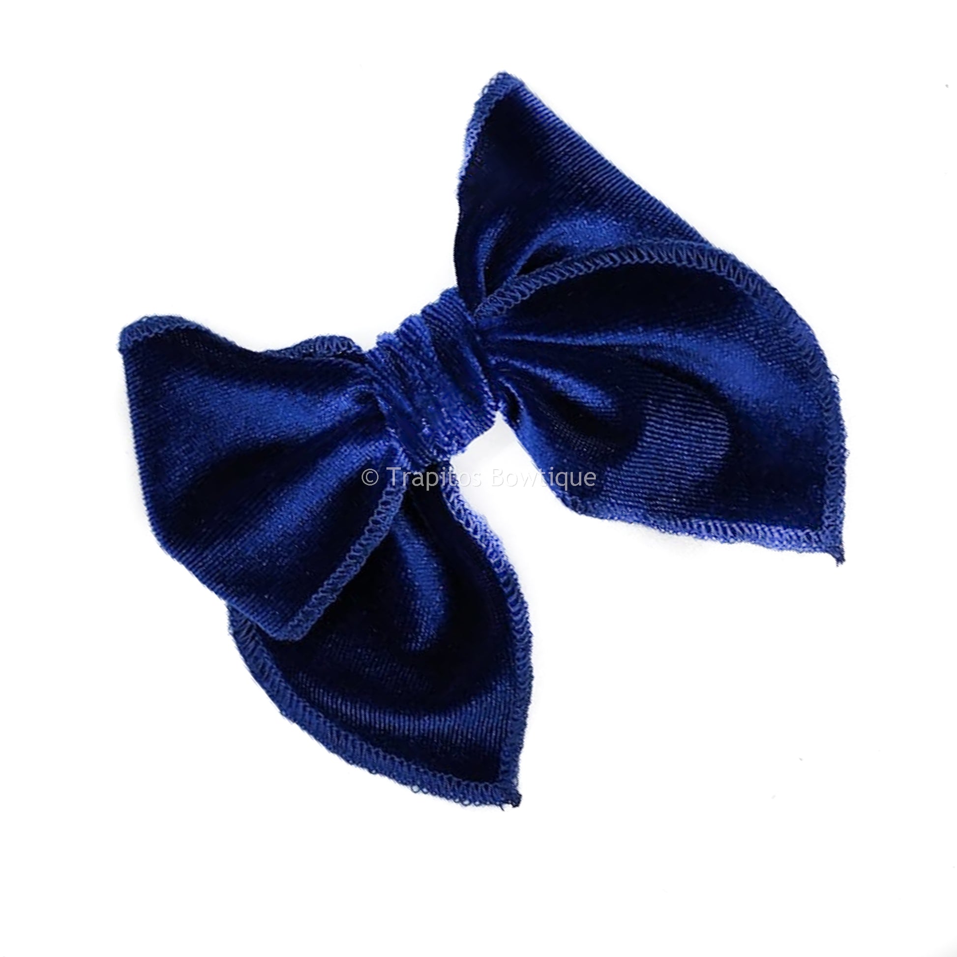 Delicada pieza de terciopelo terminada en picos por ambos lados y sujetada en el centro formando un moño, fileteado todo al rededor para darle ese toque elegante, atado a una pinza o bien a una bandita elastica de nylon segun tu preferenciapara.