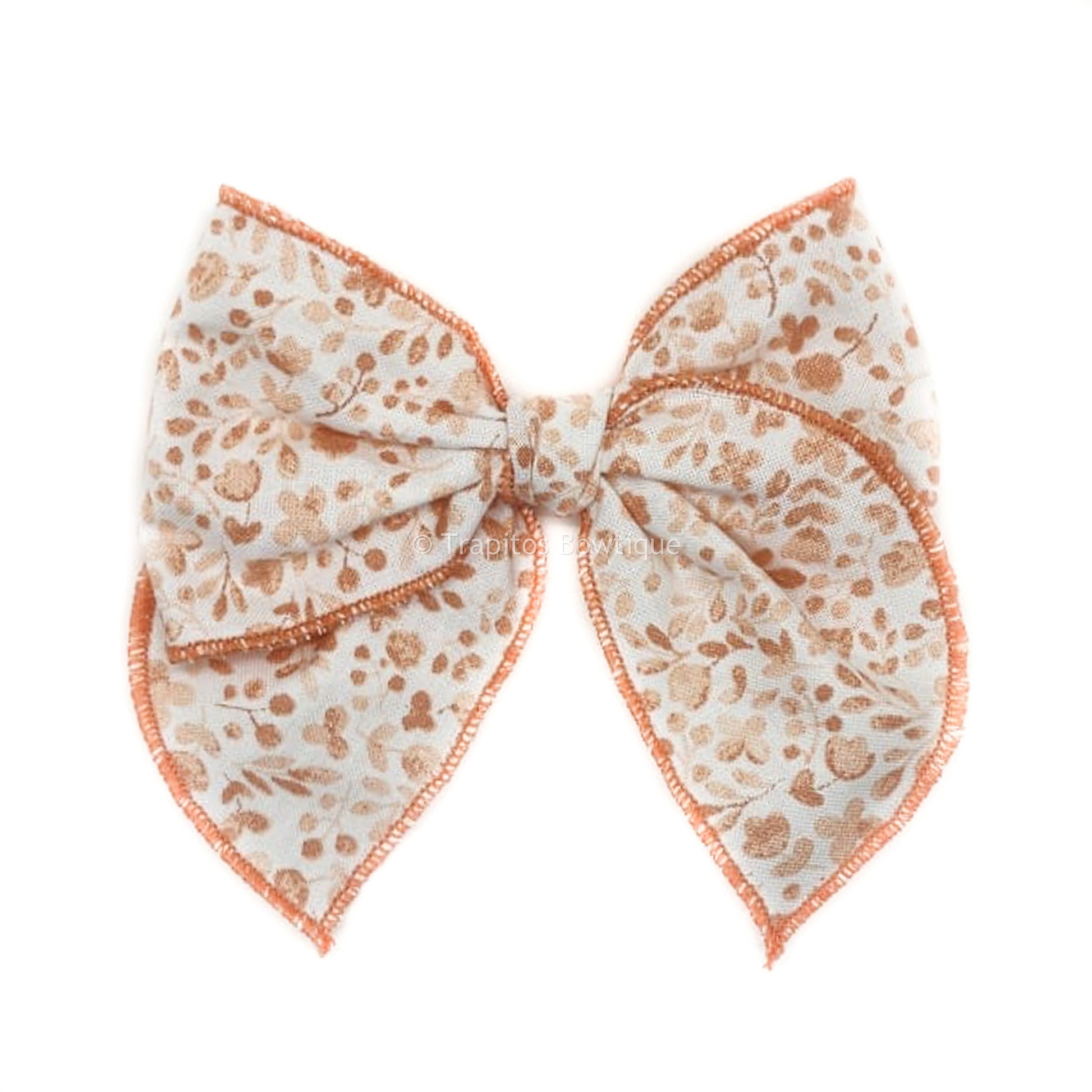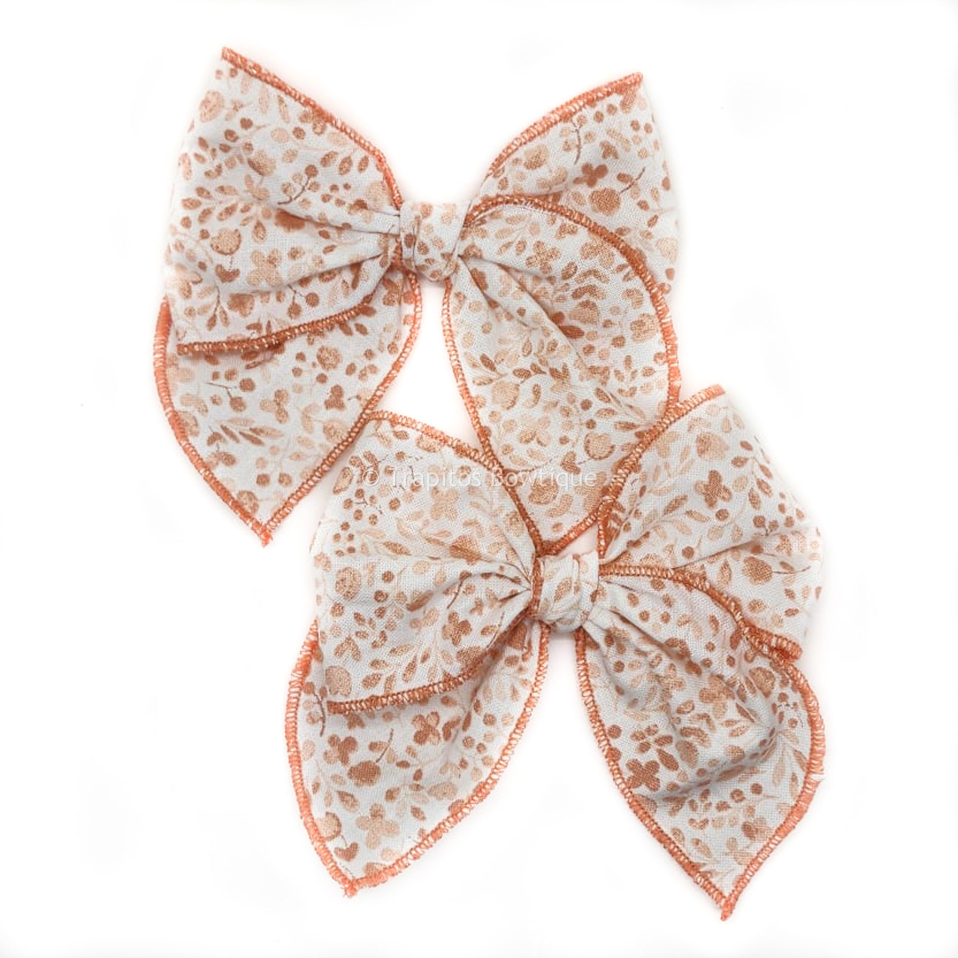 Par de moños confeccionados con tira de tela en algodon blanco con flores salmon fileteada todo el rededor, atado al centro para formar un moño con picos en los extremos y con una pinza para atarlo cada uno a las colitas de tu pequeña, las pinzas vienen en forma encontrada para sujetar uno de cada lado.