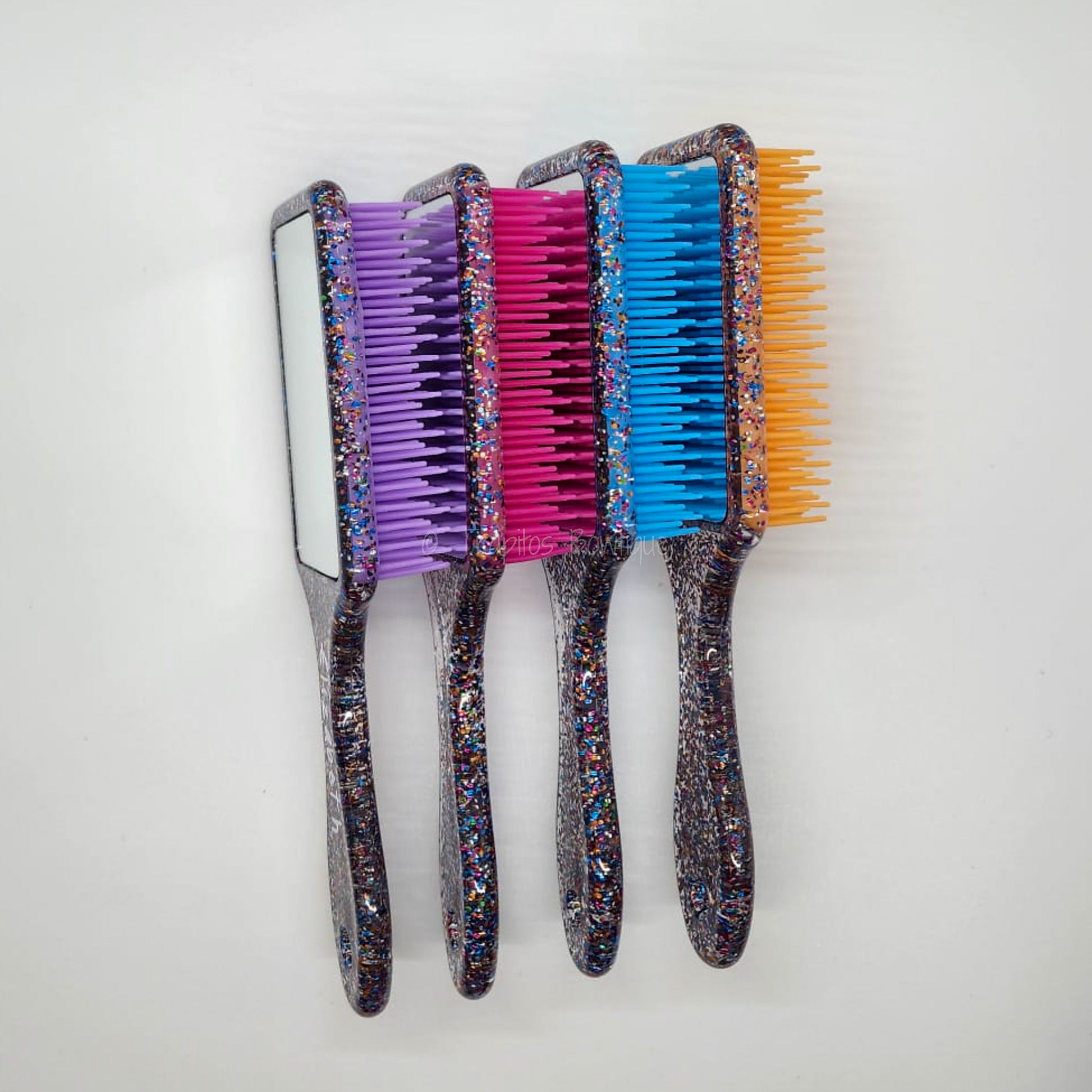 Cepillo para el cabello con cerdas de plastico, diseño transparente con glitter, espejo integrado y mando personalizable.