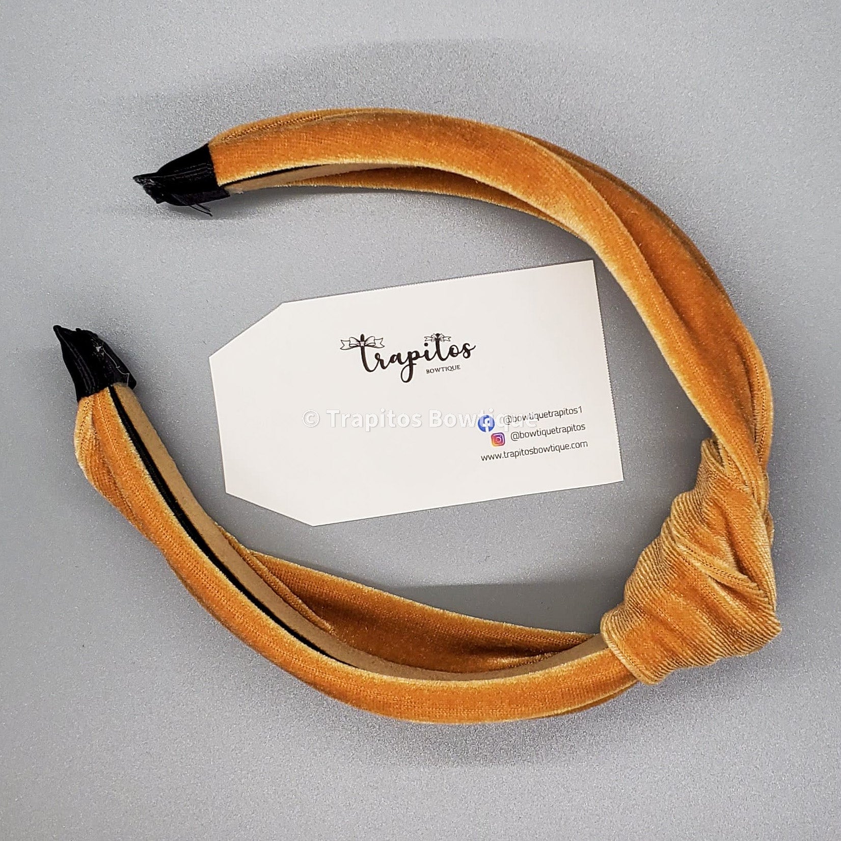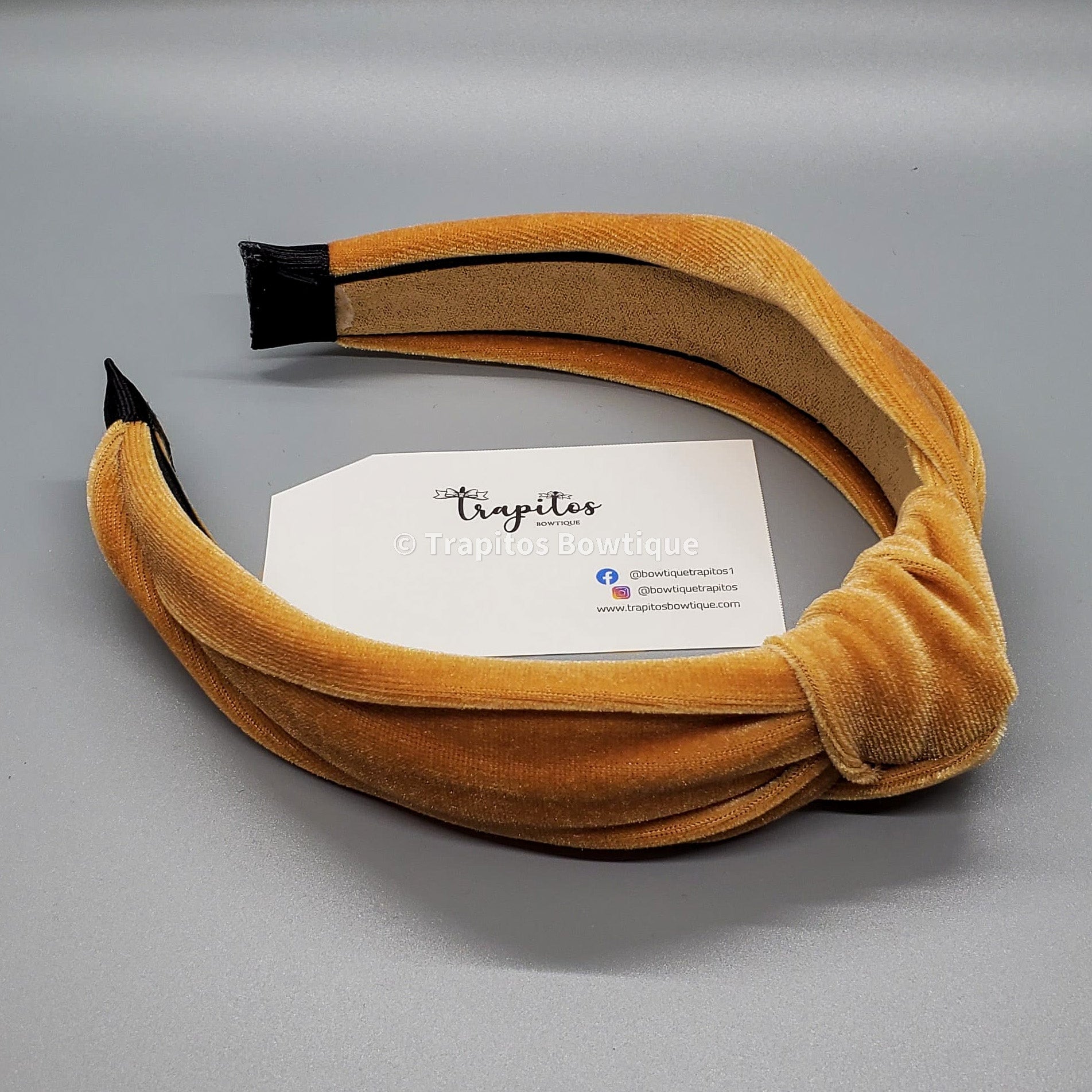 Diadema confeccionada en terciopelo Mostaza claro con nudo en la parte superior central