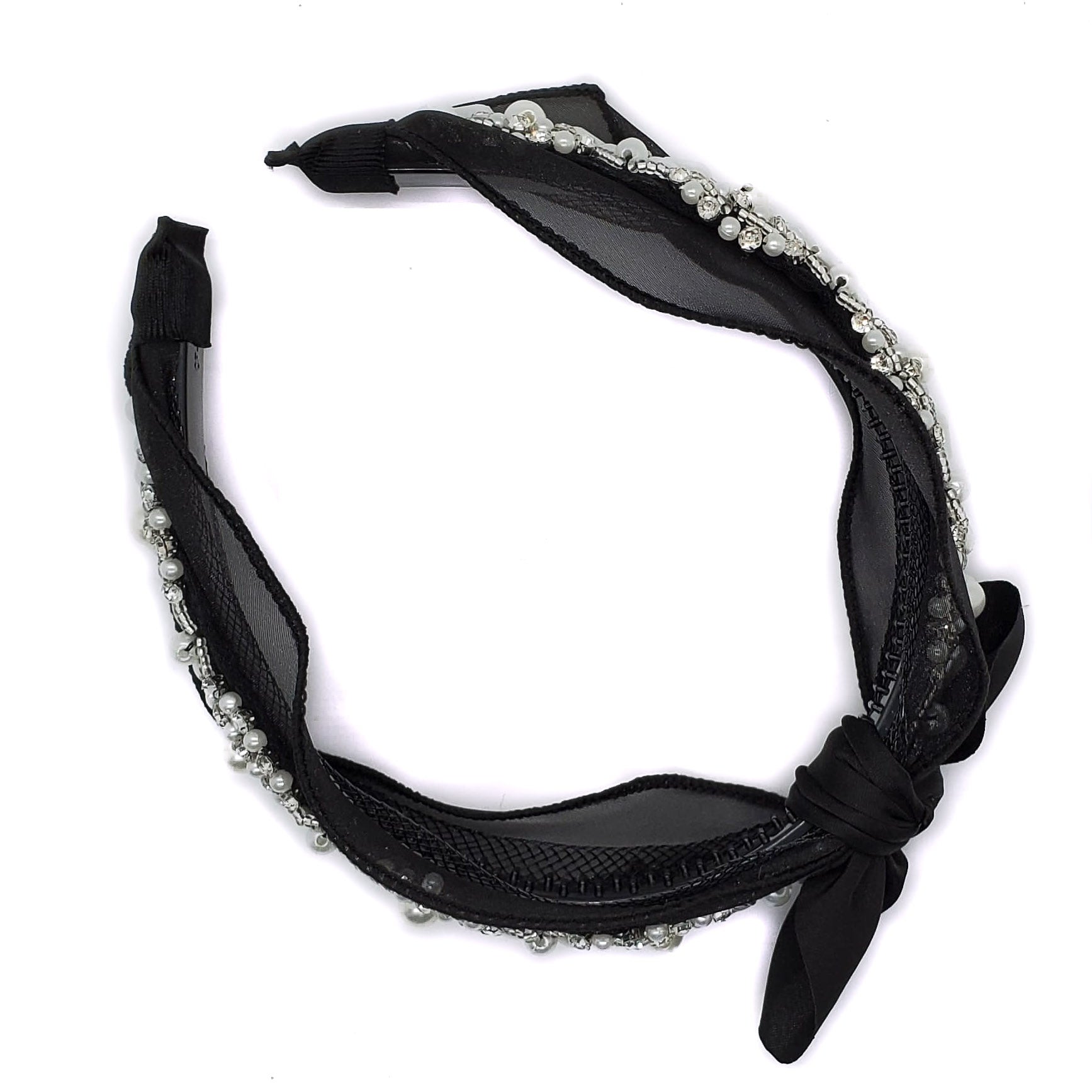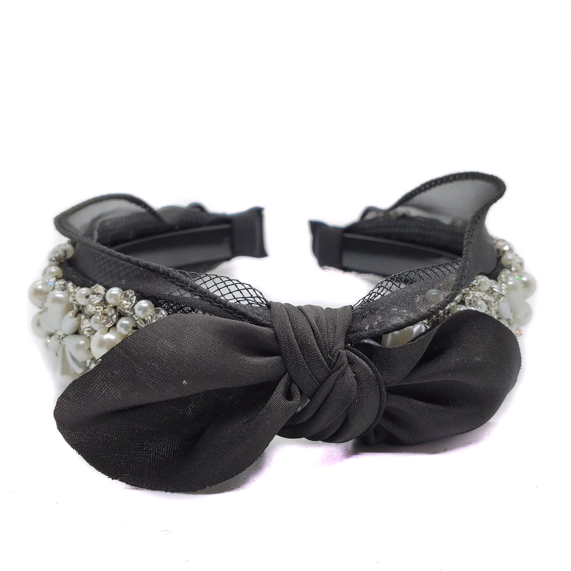 Elegante y sofisticada diadema negra adornada con perlas y piedras abrazadas por un lazo formando un pequeño moño en la parte alta.