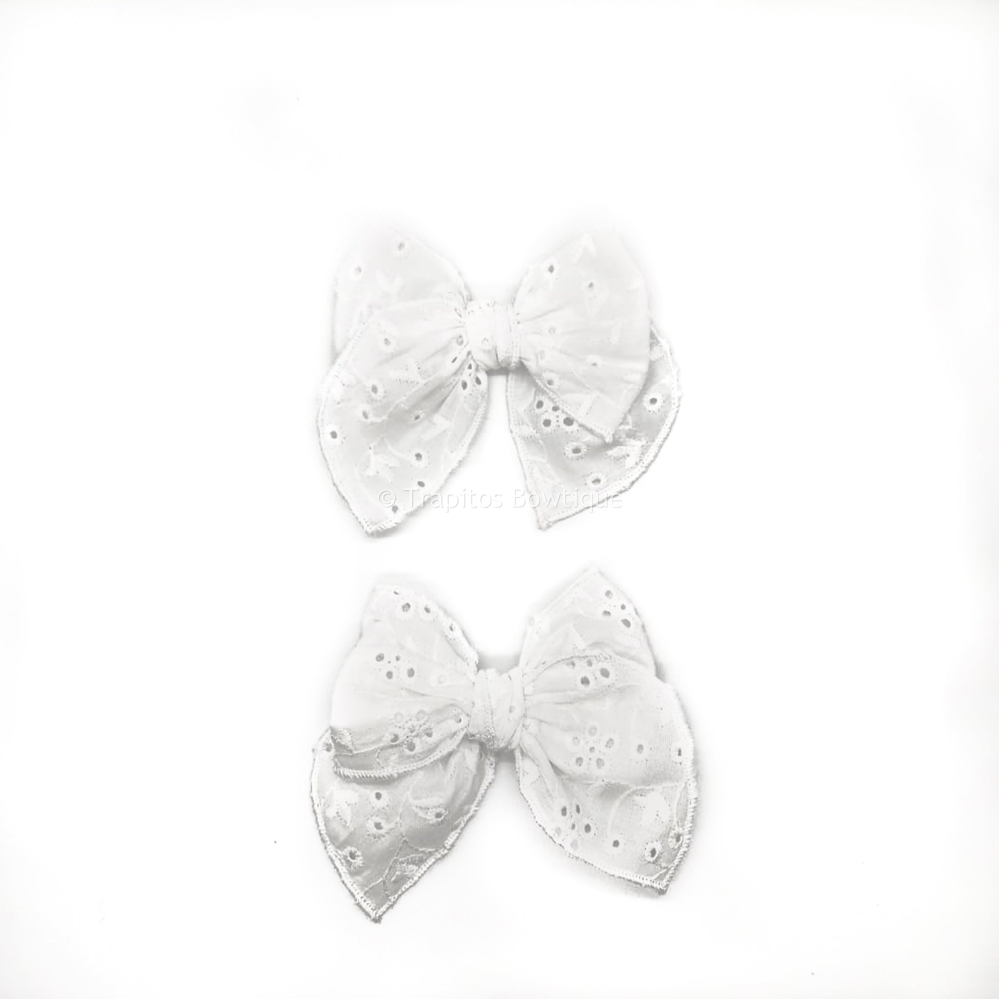 Dos pieza de tela terminadas en picos por ambos lados y atados por un nudo en el centro formando un moño, fileteado todo al rededor para darle ese toque elegante, cada pieza sujeteda a una pinza de modo encontrado para que tus colitas queden perfectas.