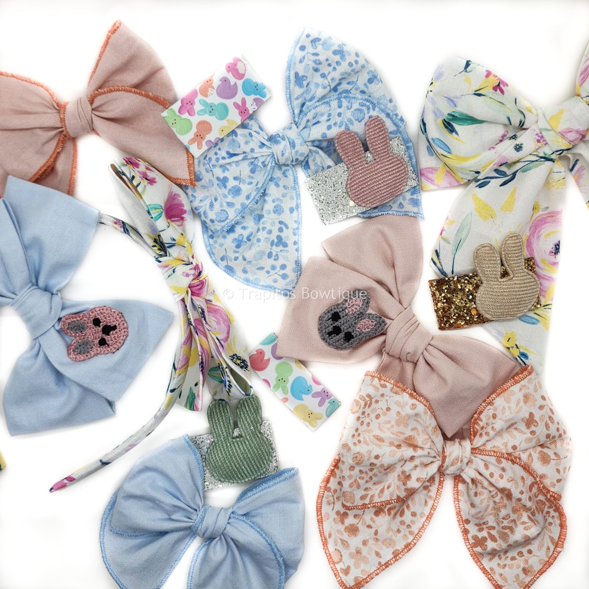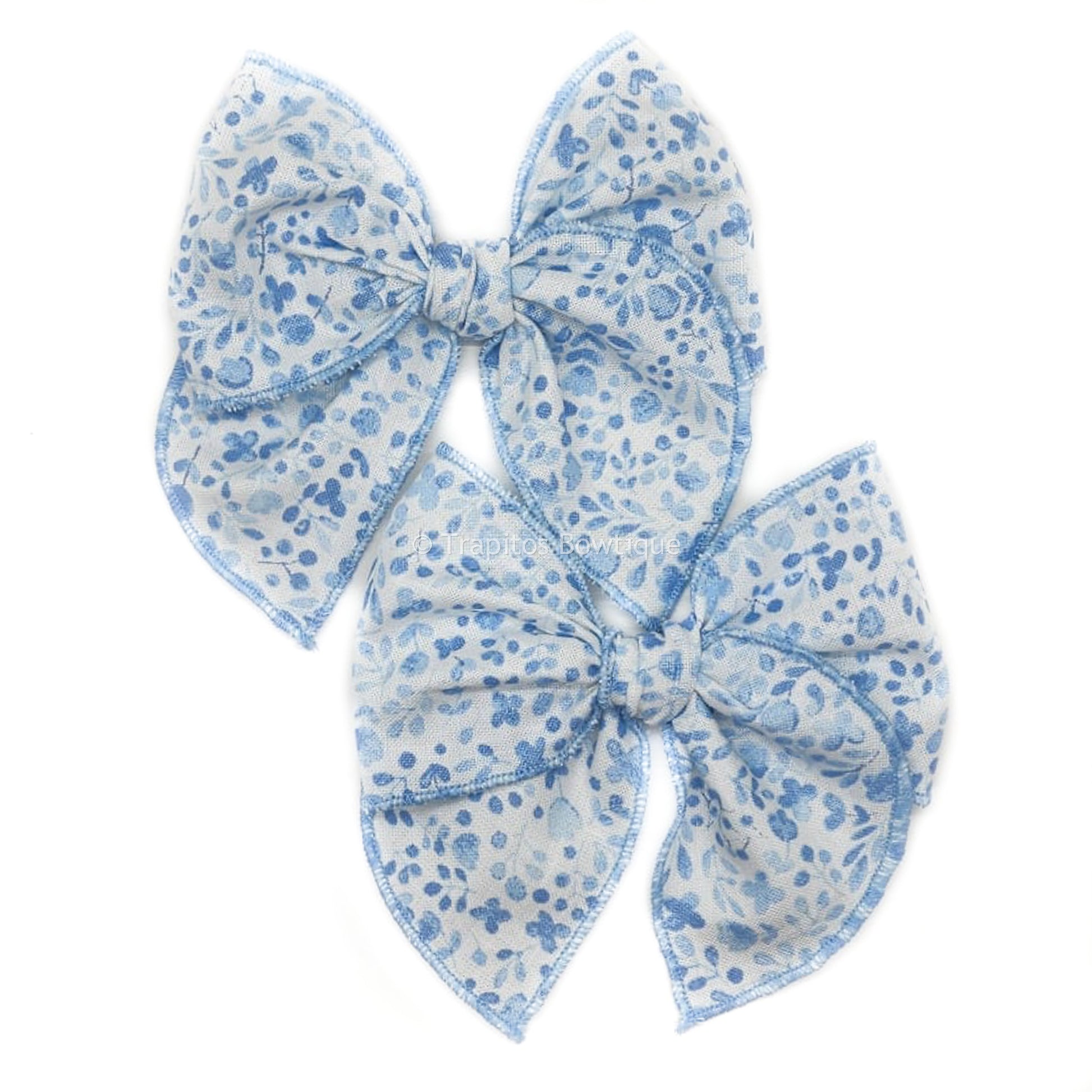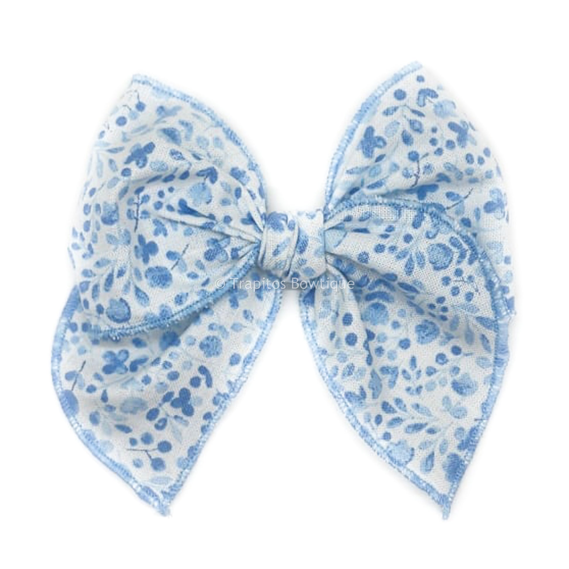 Par de moños confeccionados con tira de tela en algodon blanco con flores azules fileteada todo el rededor, atado al centro para formar un moño con picos en los extremos y con una pinza para atarlo cada uno a las colitas de tu pequeña, las pinzas vienen en forma encontrada para sujetar uno de cada lado.