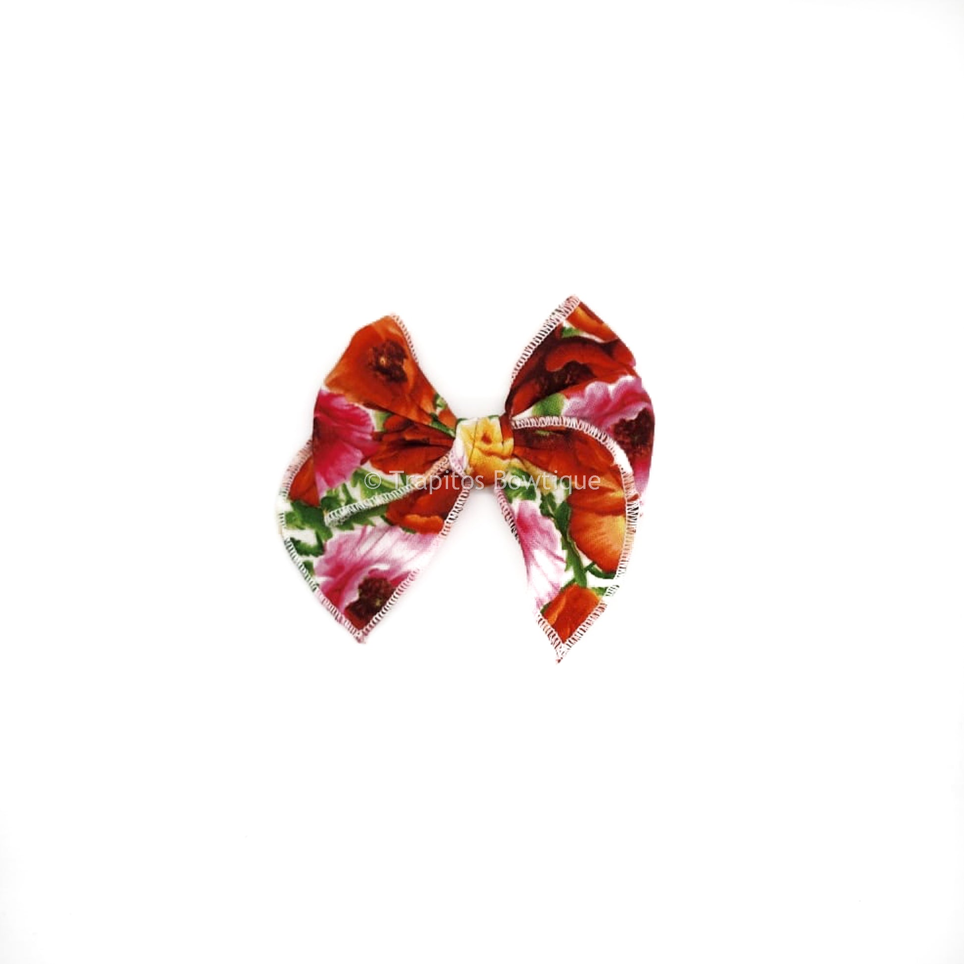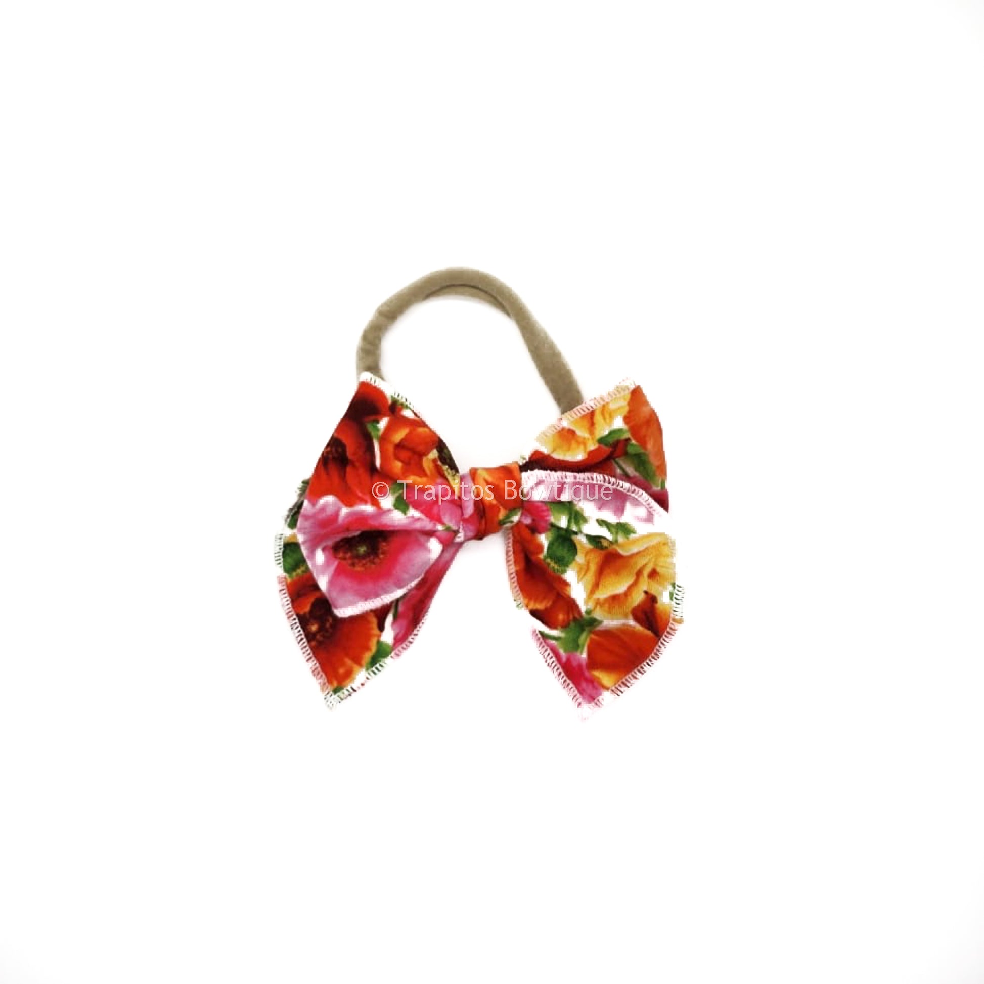 Pieza de tela estampada con coloridas flores y fileteada al rededor con terminado en picos por ambos lados y atados por un nudo en el centro formando un moño.