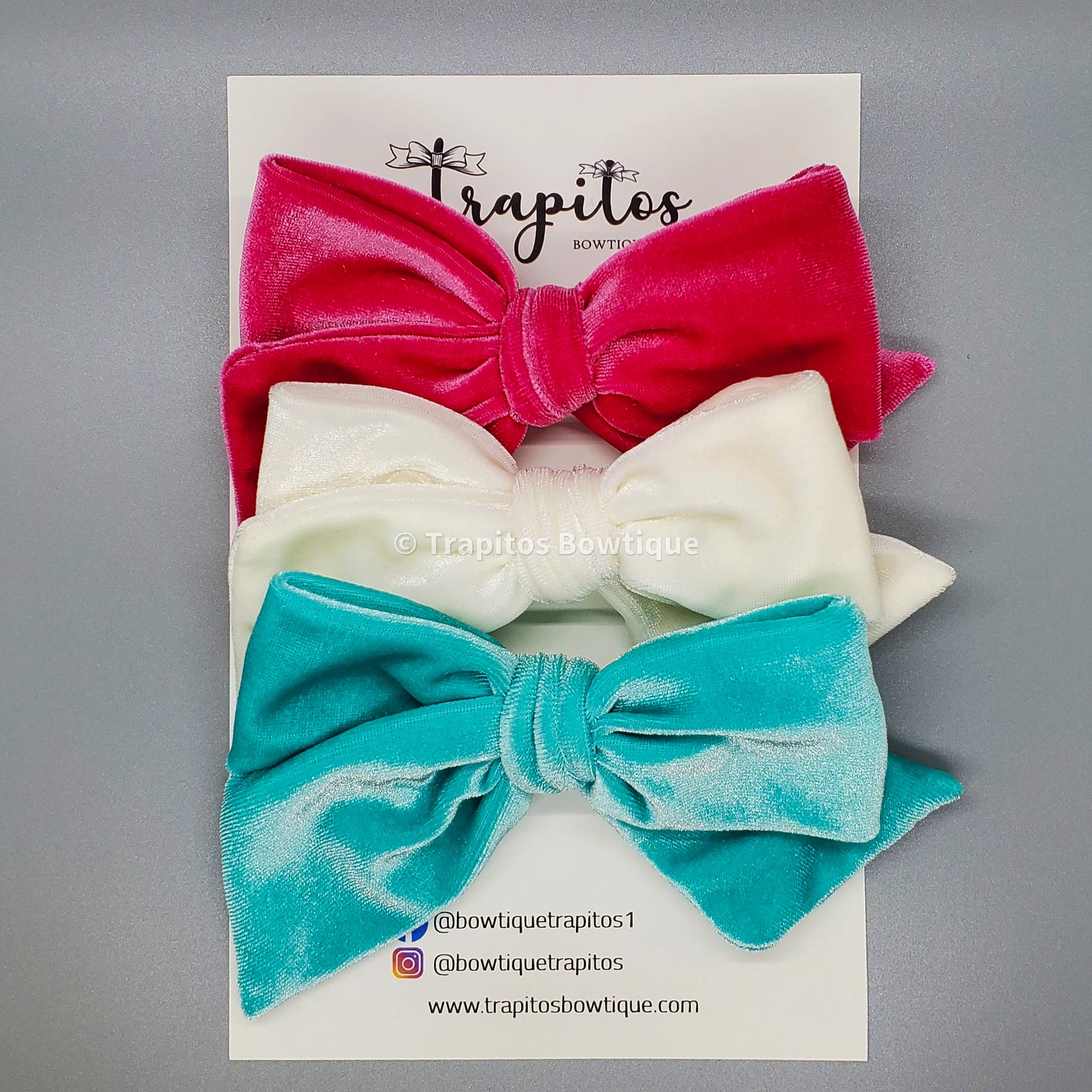 Banda de terciopelo sujetada con un delicado nudo en el centro formando un moño con pinza que podras sujetar una parte del cabello encima de una coleta o bien con bandita elastica si tu niña es mas pequeña.