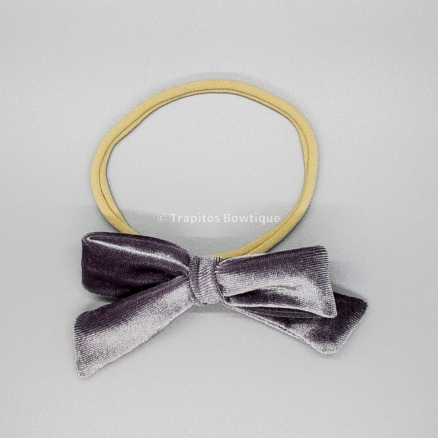Elegante y simple moño atado a mano, confeccionado en fina tela de terciopelo de alta calidad. Cortado, cosido, y atado a mano, reforzado y unido a una banda elastica en color nude, super suave y autoajustable para mayor confort de tus pequeñas, ademas al paso del tiempo puedes cortarla y remplazarla por una pinza. Pasando por un alto control de calidad por mi misma antes de ser empacado y enviado hasta tus manos.