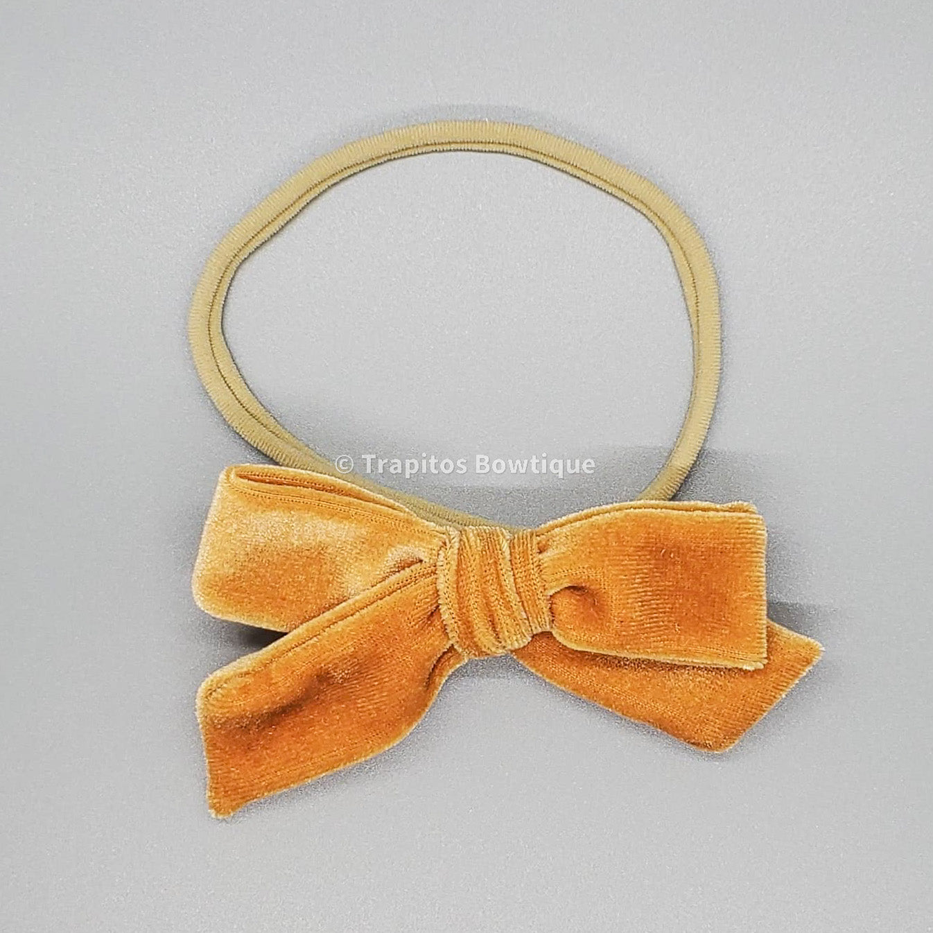 Elegante y simple moño atado a mano, confeccionado en fina tela de terciopelo de alta calidad. Cortado, cosido, y atado a mano, reforzado y unido a una banda elastica en color nude, super suave y autoajustable para mayor confort de tus pequeñas, ademas al paso del tiempo puedes cortarla y remplazarla por una pinza. Pasando por un alto control de calidad por mi misma antes de ser empacado y enviado hasta tus manos.