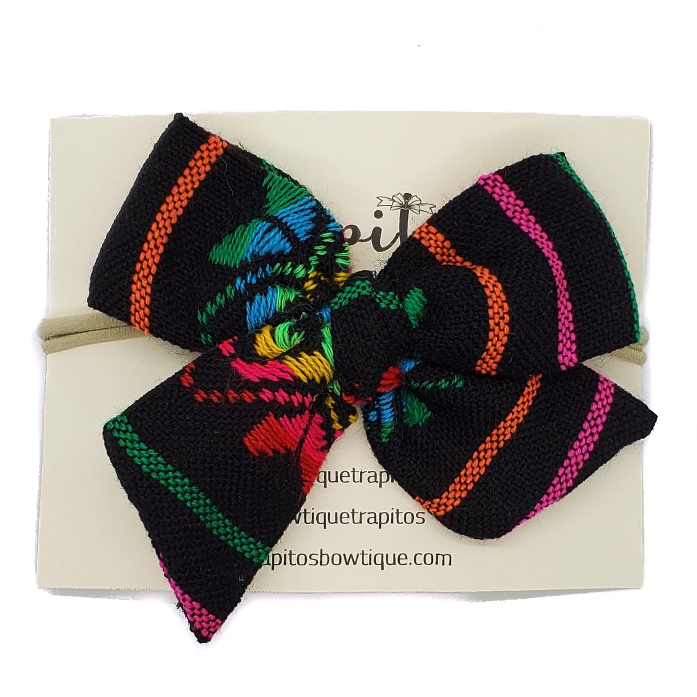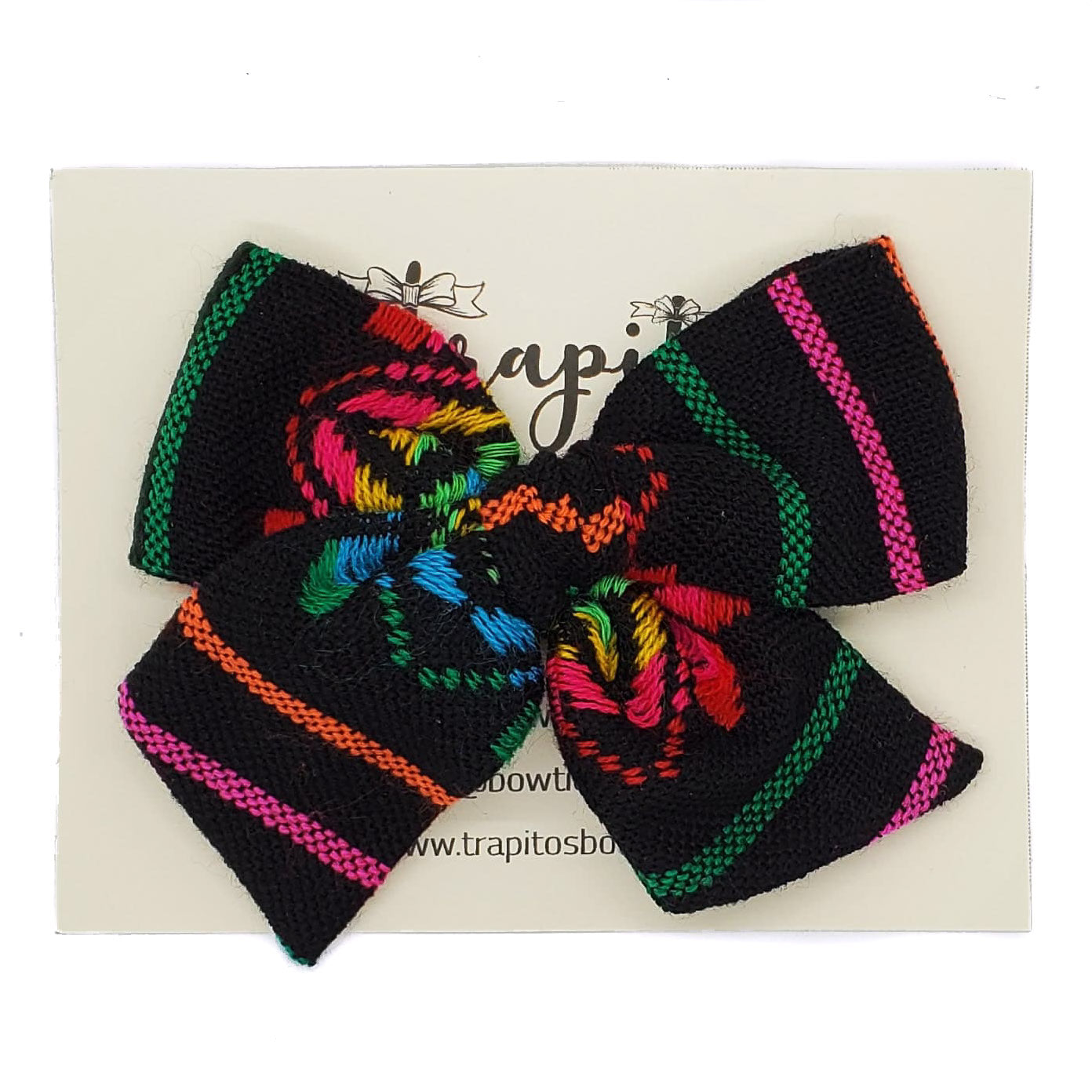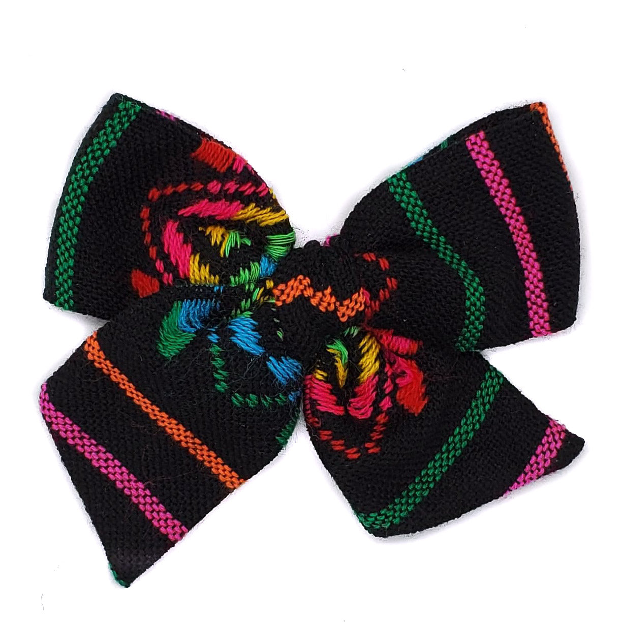 Hermoso moño confeccionado en tela sobre la base de franjas de hilos con diferentes colores vivos entre los cuales predomina el negro.
