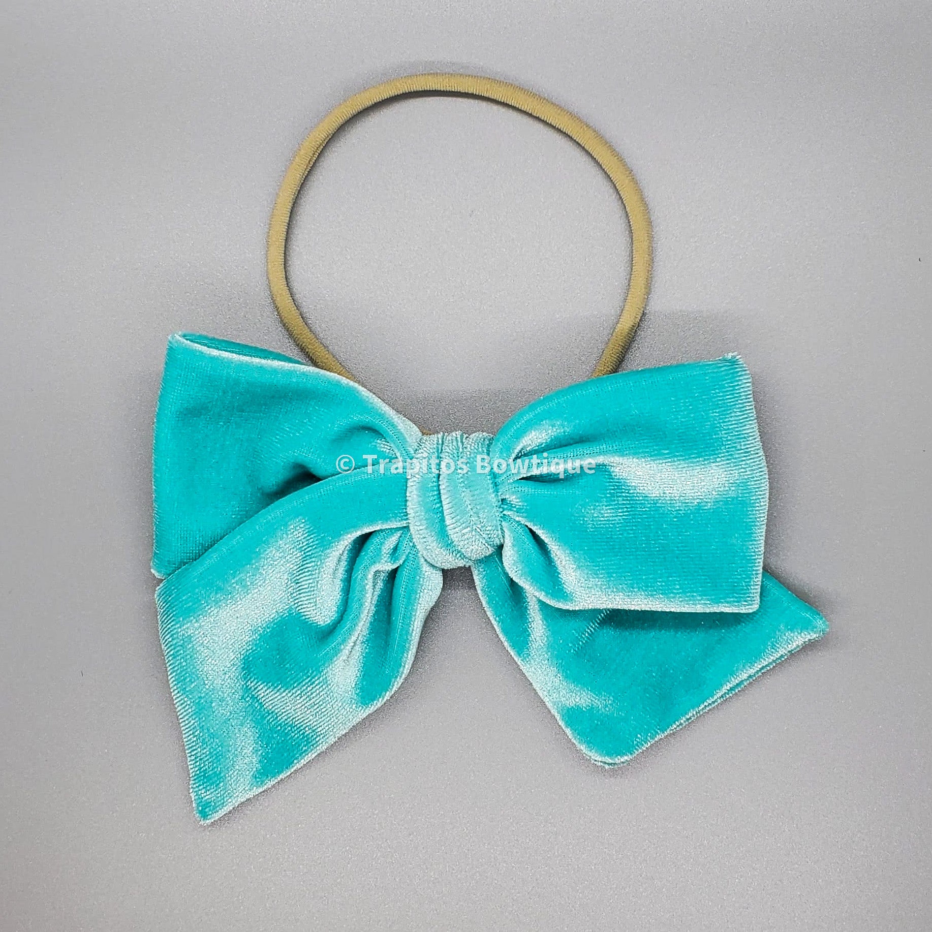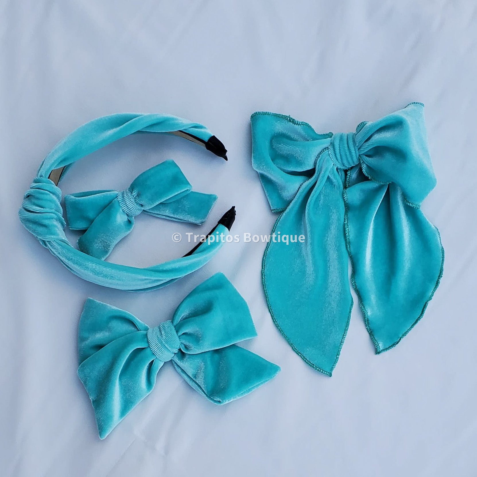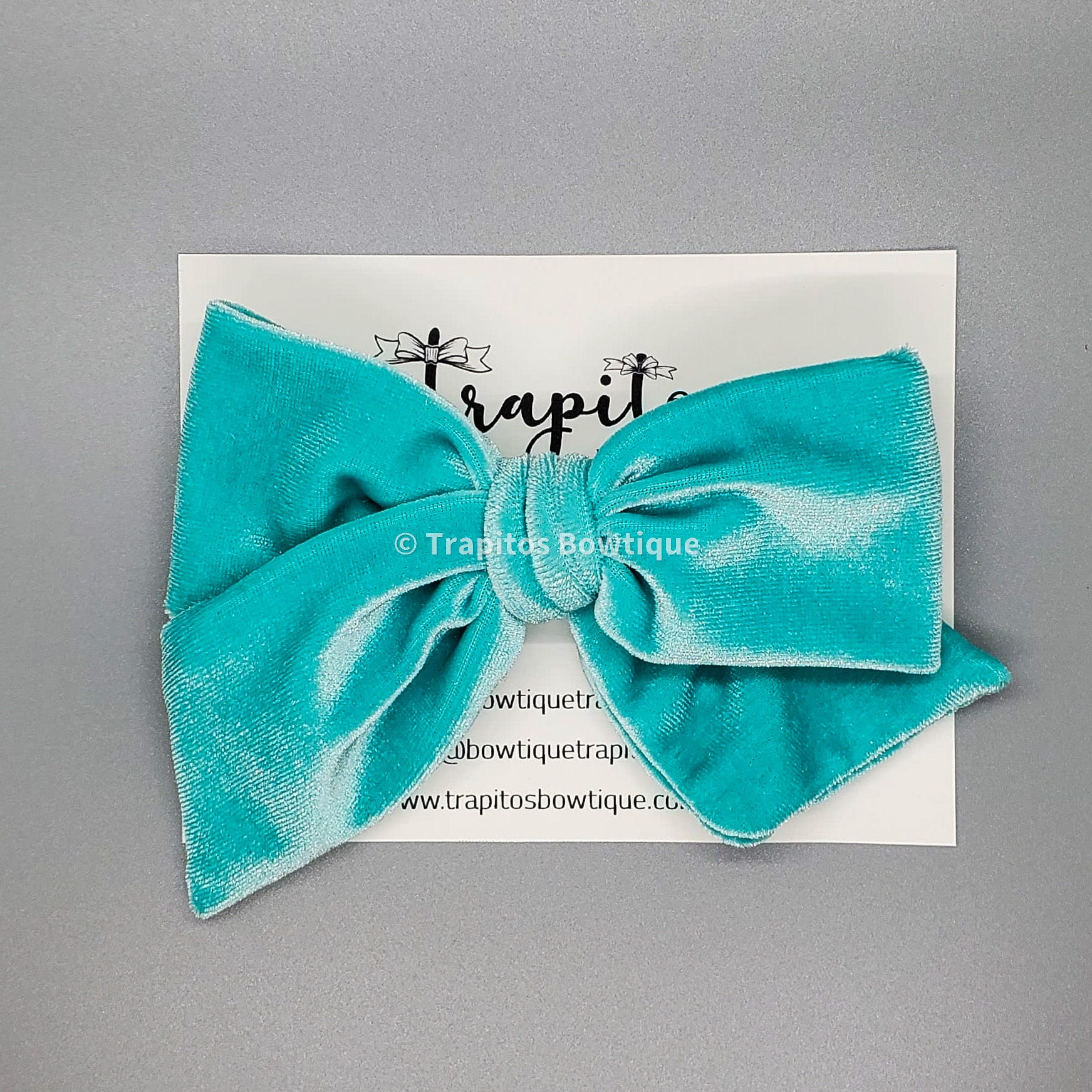 Banda de terciopelo sujetada con un delicado nudo en el centro formando un moño con pinza que podras sujetar una parte del cabello encima de una coleta o bien con bandita elastica si tu niña es mas pequeña.