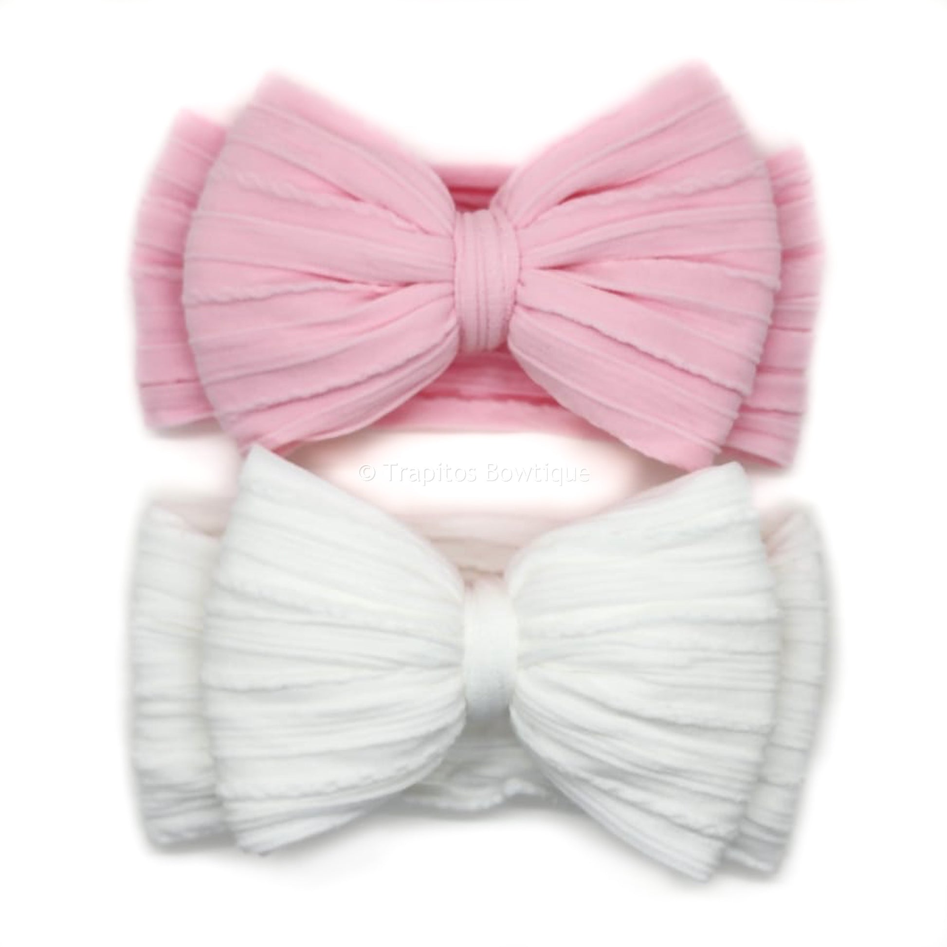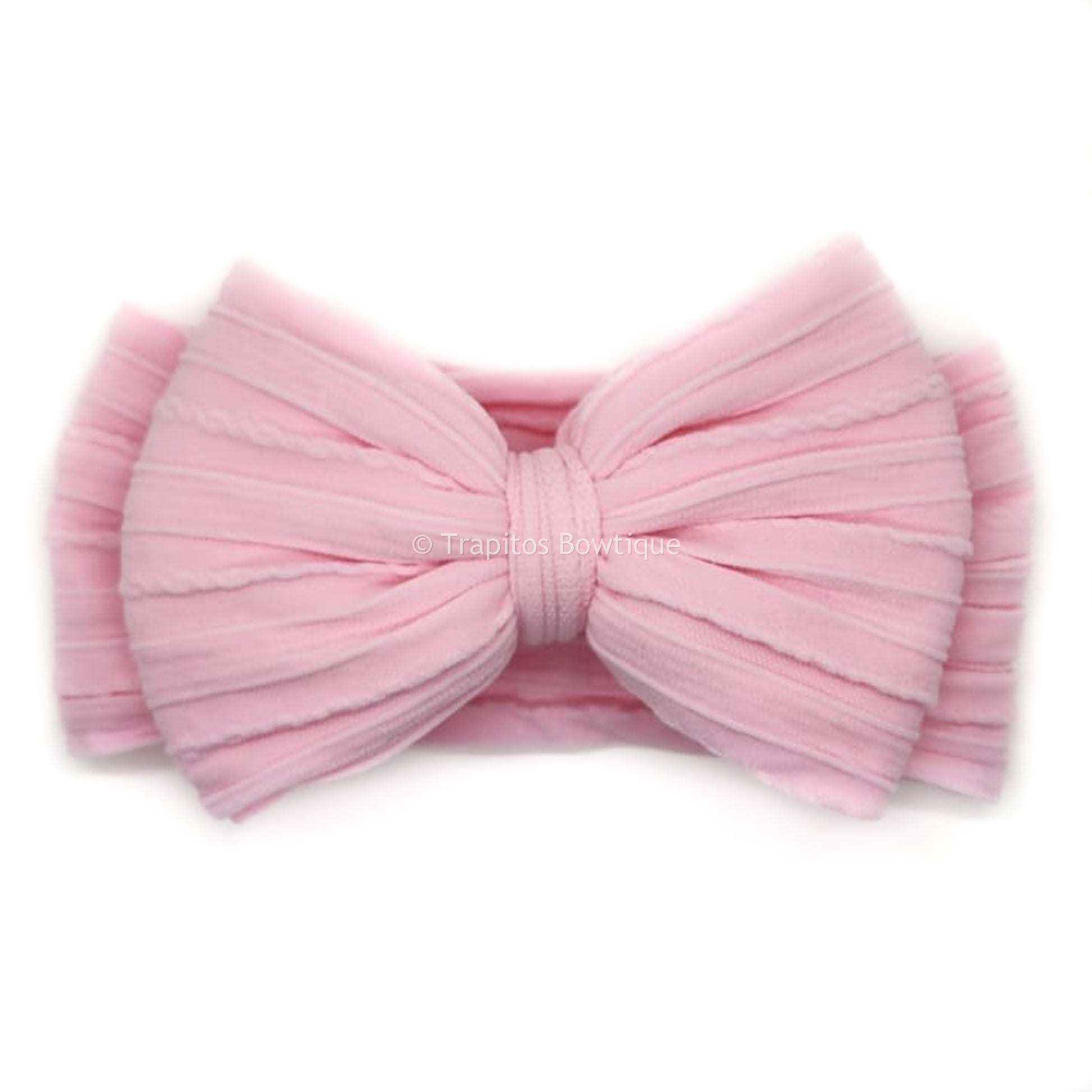 Diadema tipo turbante atado al centro para formar un moño. Elaborada con nylon y algodon elastico para mayor suavidad y confort de tu bebe.