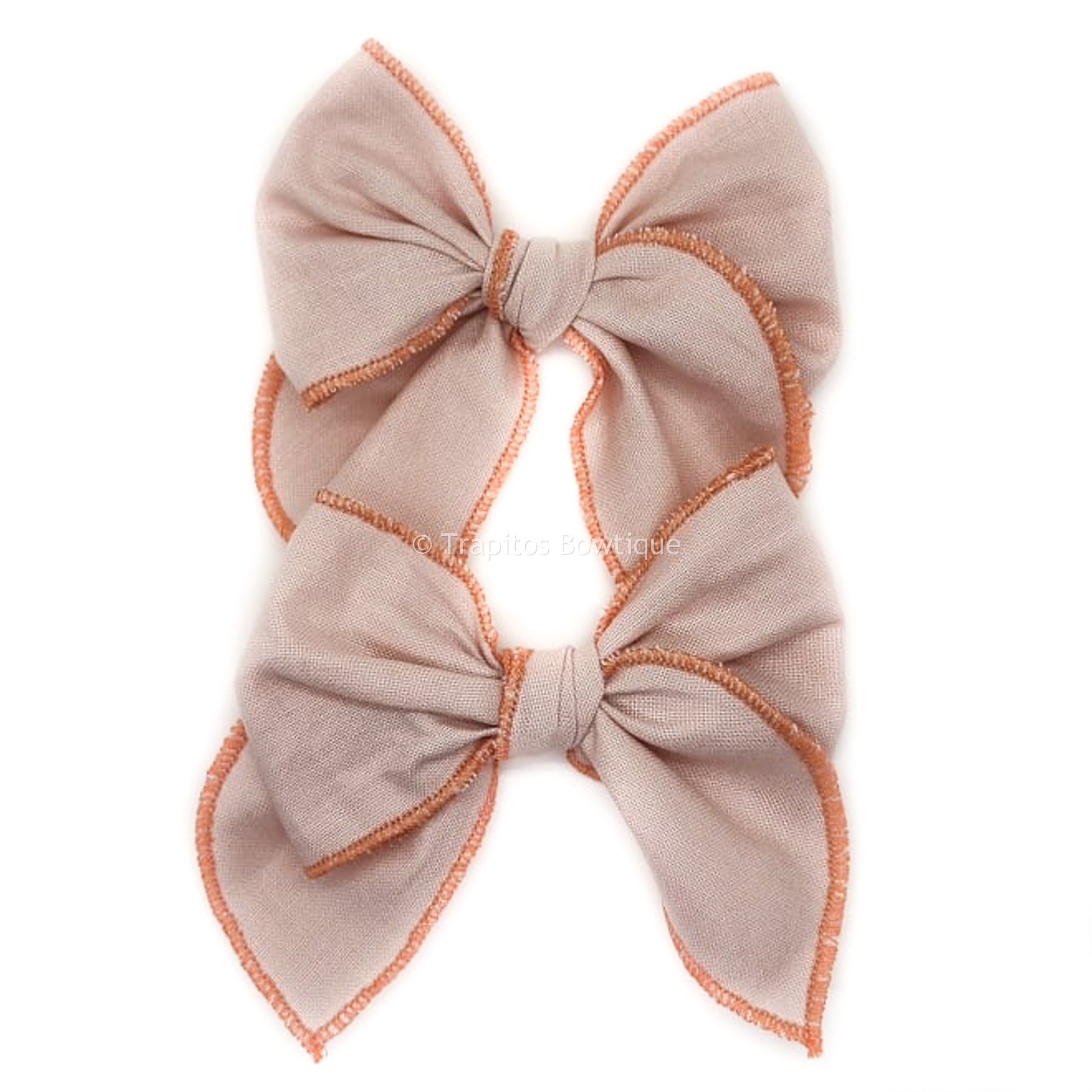 2 moños confeccionados con pieza de tela de algodon en color salmon fileteada al rededor con terminado en picos por ambos lados y atados por un nudo en el centro formando un moño.
