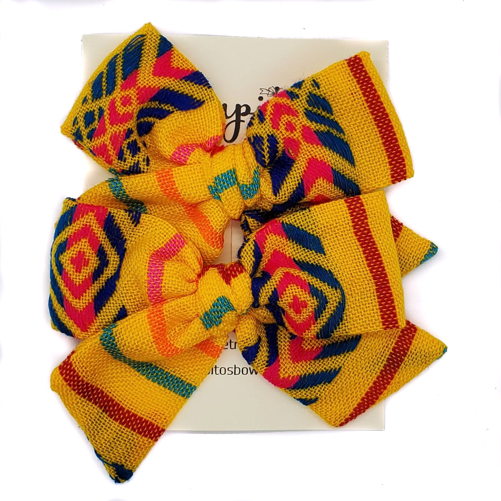 Elegante y simple par de moños atados a mano, confeccionado en fina tela de camboya de alta calidad a base de franjas de hilos con diferentes colores vivos entre los cuales predomina el amarillo. Cada uno esta cortado, cosido, planchado, atado a mano, reforzado y unido a una pequeña pinza, situados en direcciones opuestas para facilitar su anclaje de cada lado de las colitas de tus pequeñas. Pasando por un alto control de calidad por mi misma antes de ser empacado y enviado hasta tus manos.
