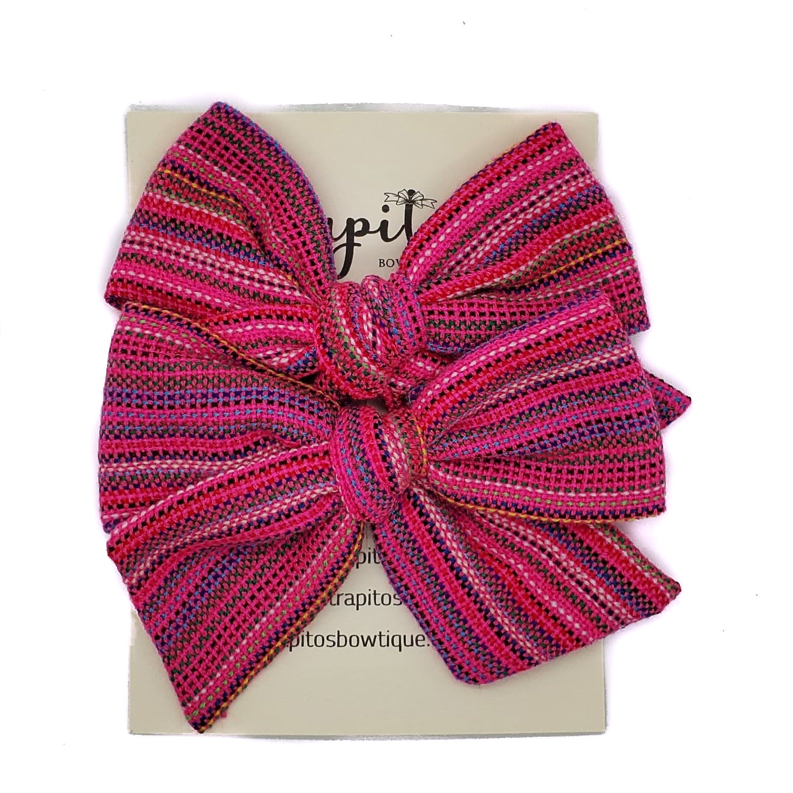 Elegante y simple par de moños atados a mano, confeccionado en fina tela de camboya de alta calidad a base de franjas de hilos con diferentes colores vivos entre los cuales predomina el rosa. Cada uno esta cortado, cosido, planchado, atado a mano, reforzado y unido a una pequeña pinza, situados en direcciones opuestas para facilitar su anclaje de cada lado de las colitas de tus pequeñas. Pasando por un alto control de calidad por mi misma antes de ser empacado y enviado hasta tus manos.